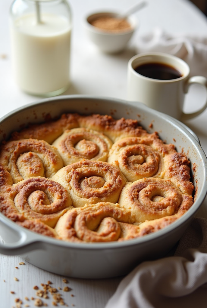 Mix 1 tablespoon of brown sugar, ½ teaspoon of cinnamon, and a splash of almond milk in a small bowl. Swirl this mixture into the batter in the baking dish to mimic cinnamon roll layers.